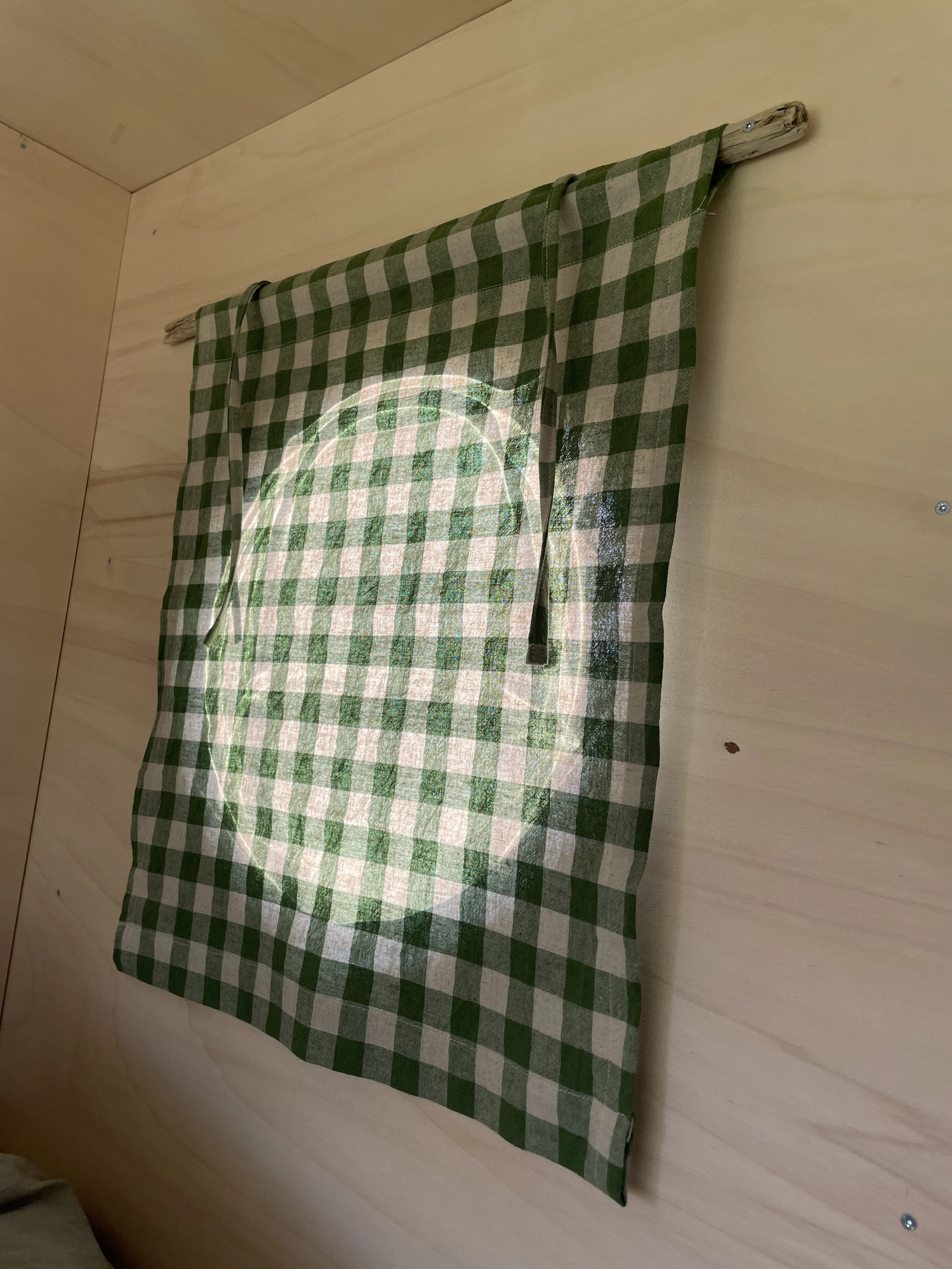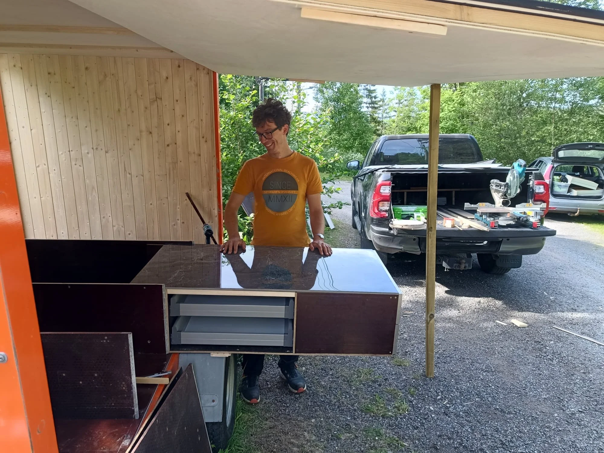 Vi er opptatt av naturlige materialer, camperen er kledd med trevirke og er i hovedsak laget av restmateriale fra andre prosjekter og hyllesystemet som var i tilhengeren tidligere. Vinduene er fra kasserte vaskemaskiner. Kjøkkenplaten er en storformat keramikkflis, en test som har vist seg å overleve selv de mest humpete vegene.